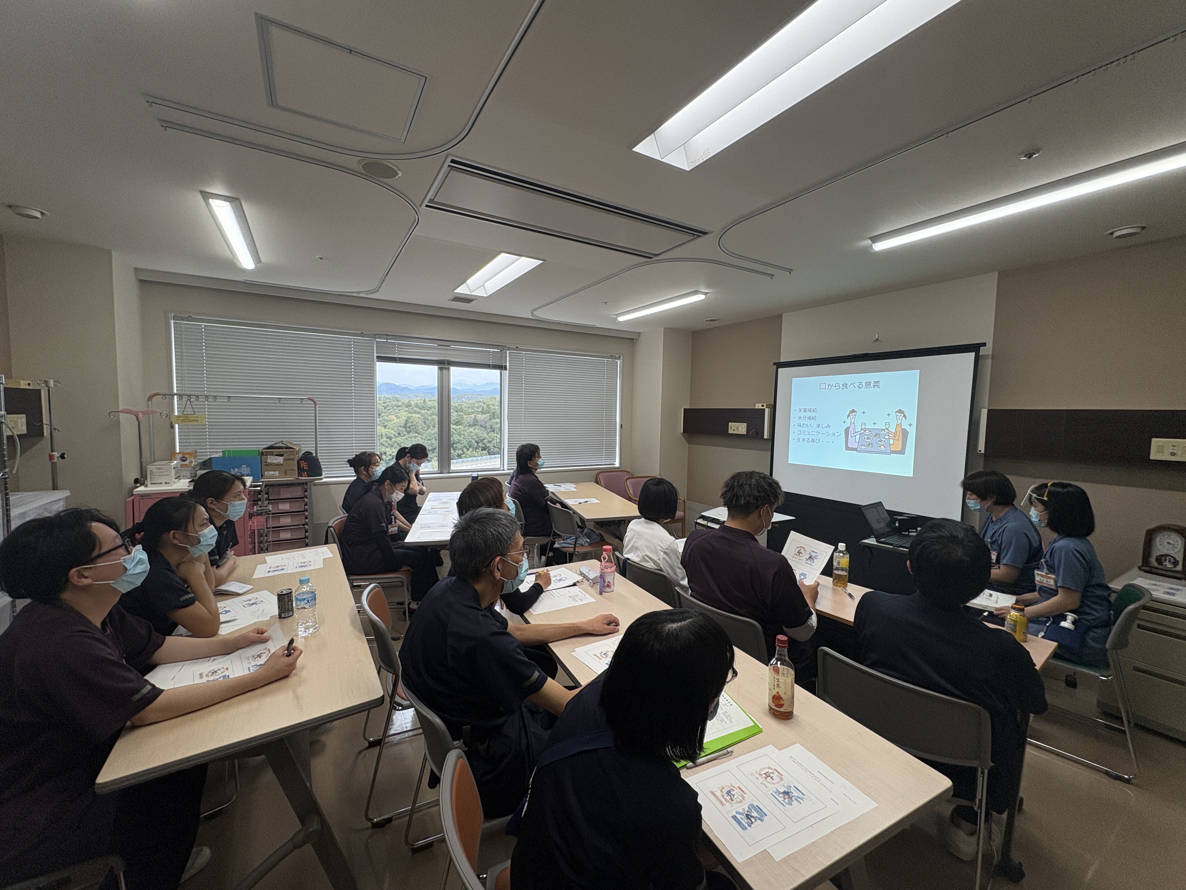 午前中は、病院の概要・機能と組織の理解や医療安全の基礎知識について、座学やグループワークで学びました。