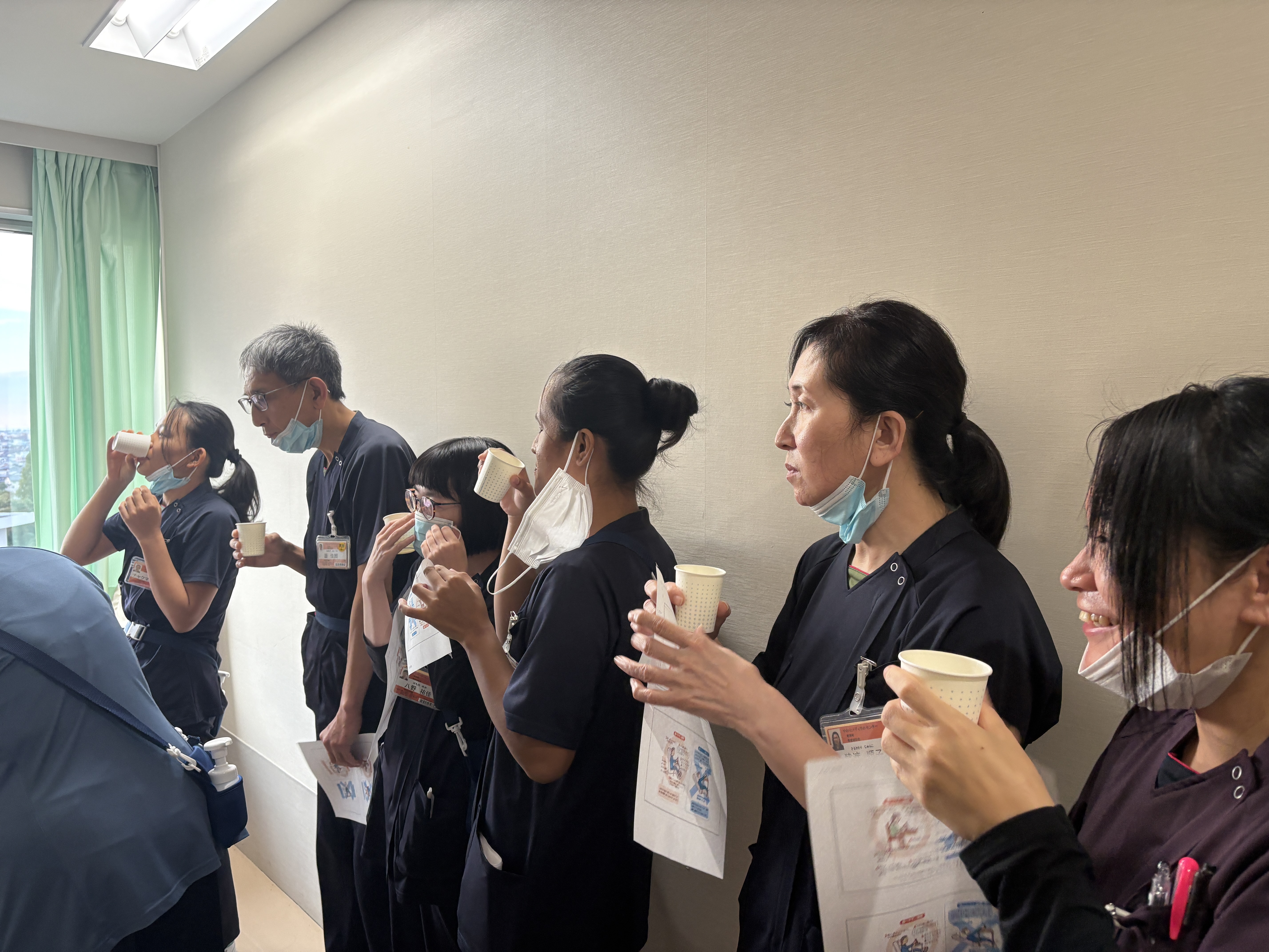 患者さんに提供しているとろみ水(とろみが薄め・中間のもの)を実際に飲んでみて、味や飲みやすさを確認したり、ベッドで食事をする際に適したベッドの角度や枕の位置、机の高さなどを患者さんになりきって体験したりしました。