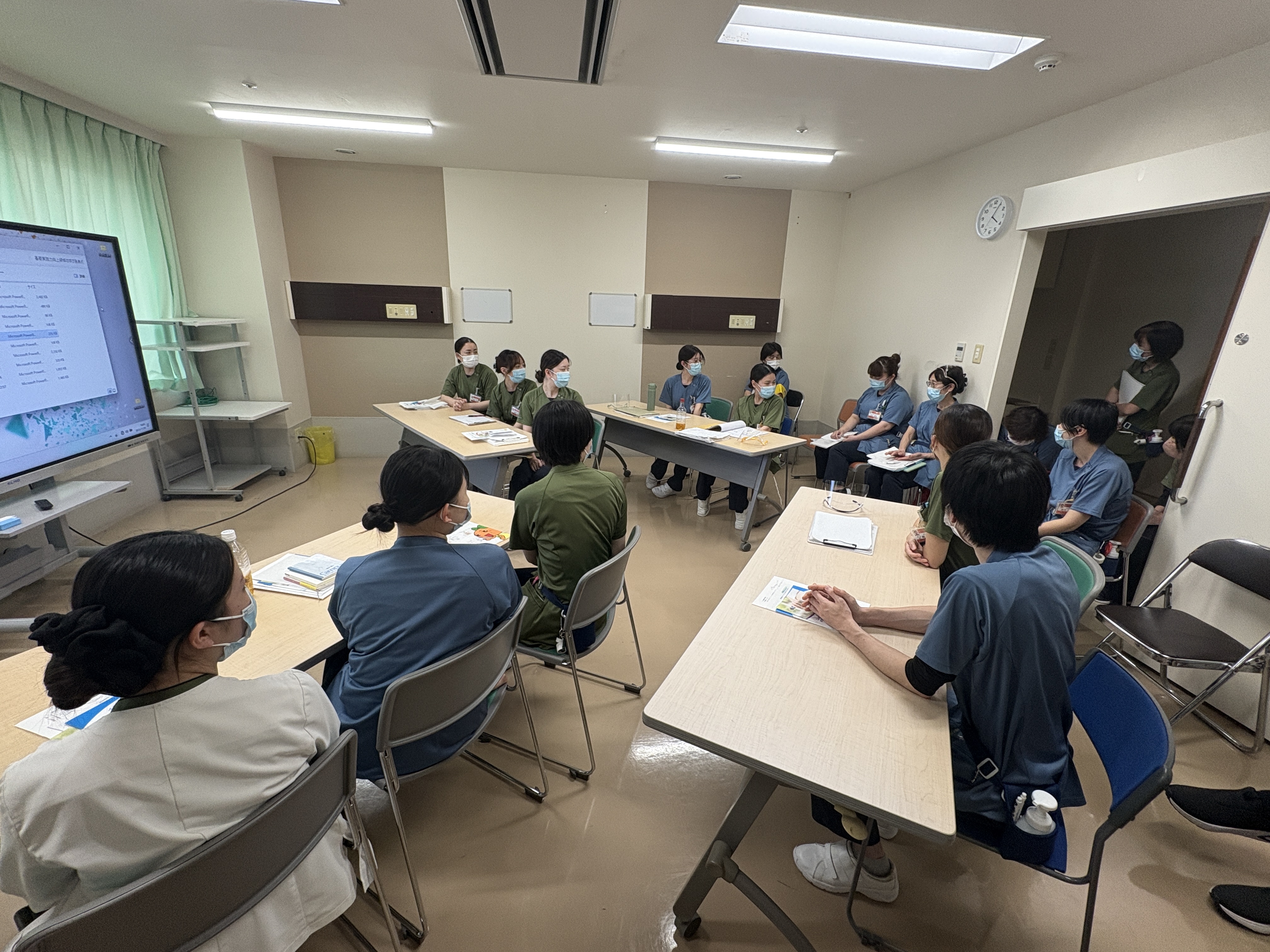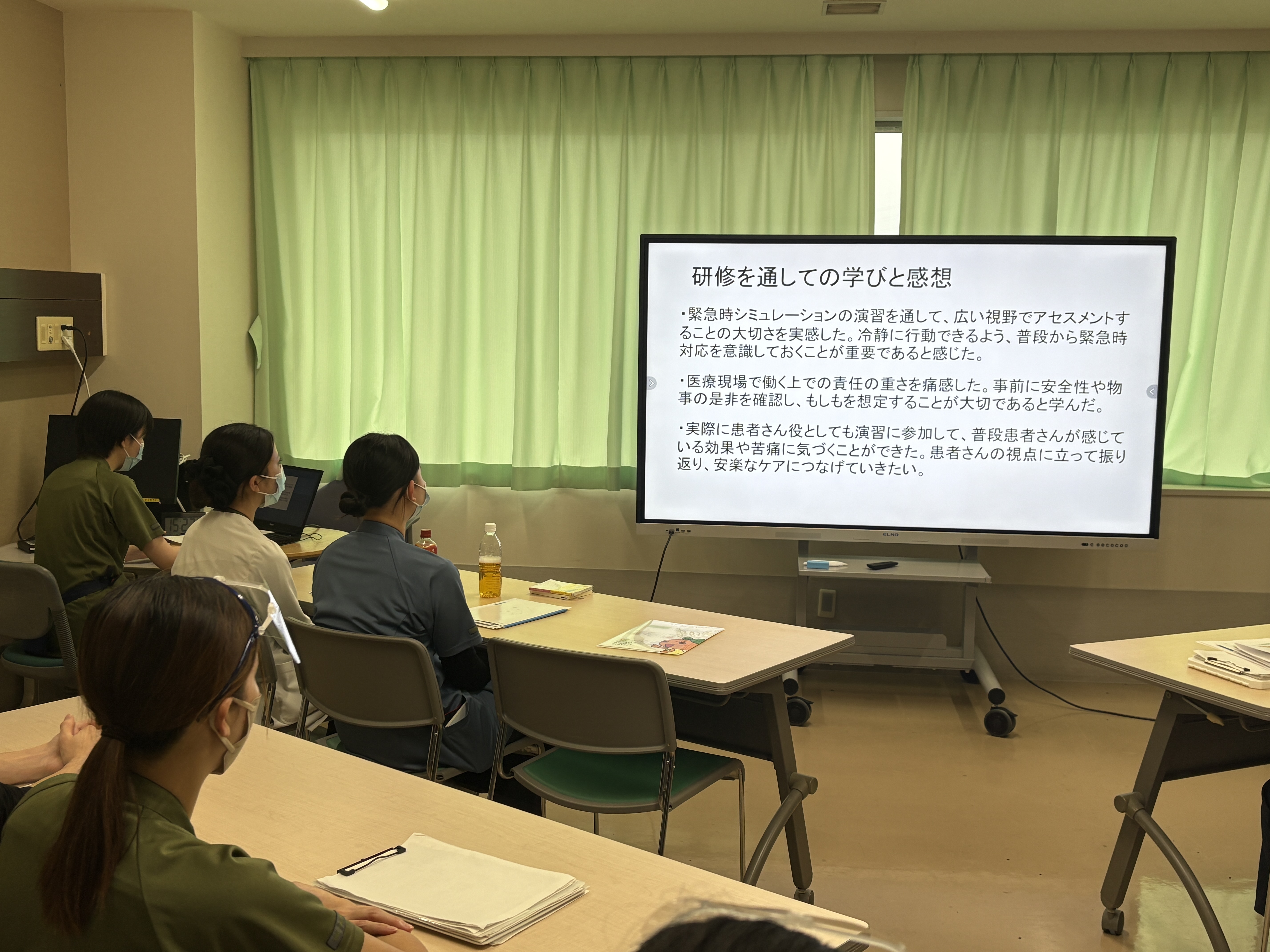 今回の研修では、9月に金大附属病院で行われた「新人看護師基礎実践力向上研修」で学んだことについて、新人職員一人ひとりが発表を行いました。各職員は研修を通じて得た知識や気付き、今後の業務に活かしたいポイントなどを、自分の言葉で丁寧に発表されていました。