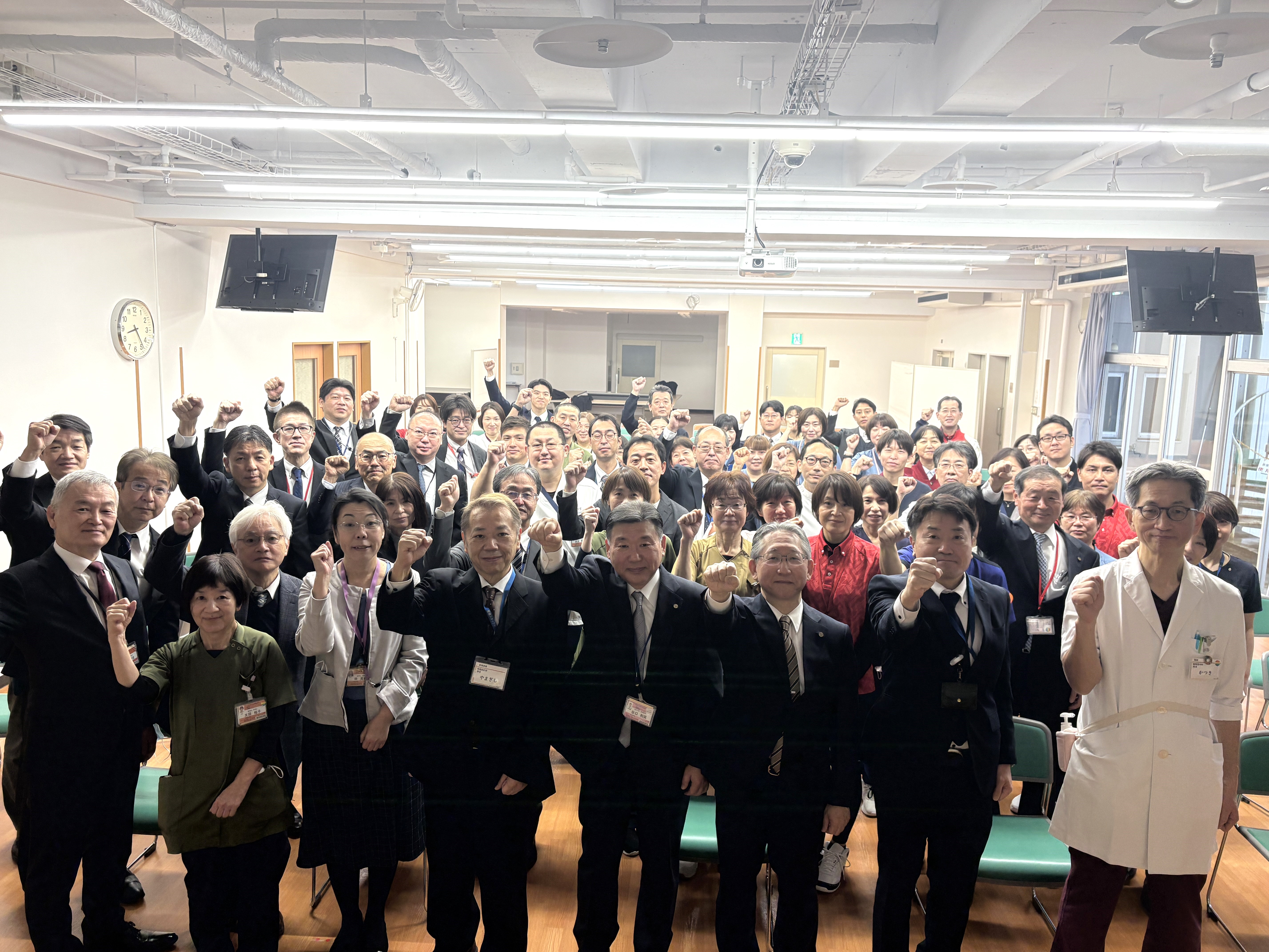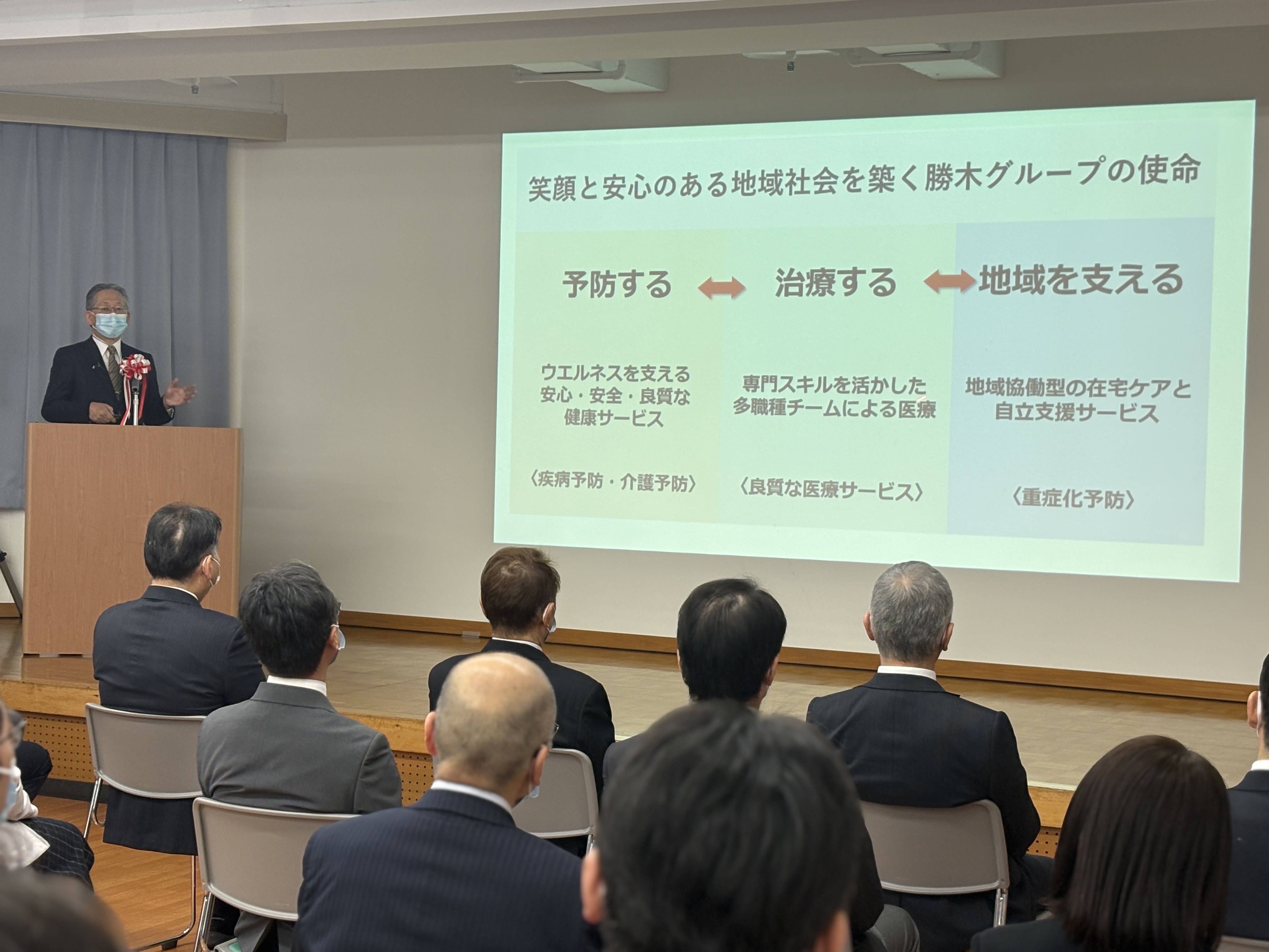 グループ代表からは年末年始に出勤された職員、送りだしてくれたご家族への感謝が述べられました。続いて、各事業所の2025年の振り返りや南加賀医療圏の概況、勝木グループの使命とダイナミックリニューアルについて、そして2030年に向けたビジョンと方向性について説明がありました。