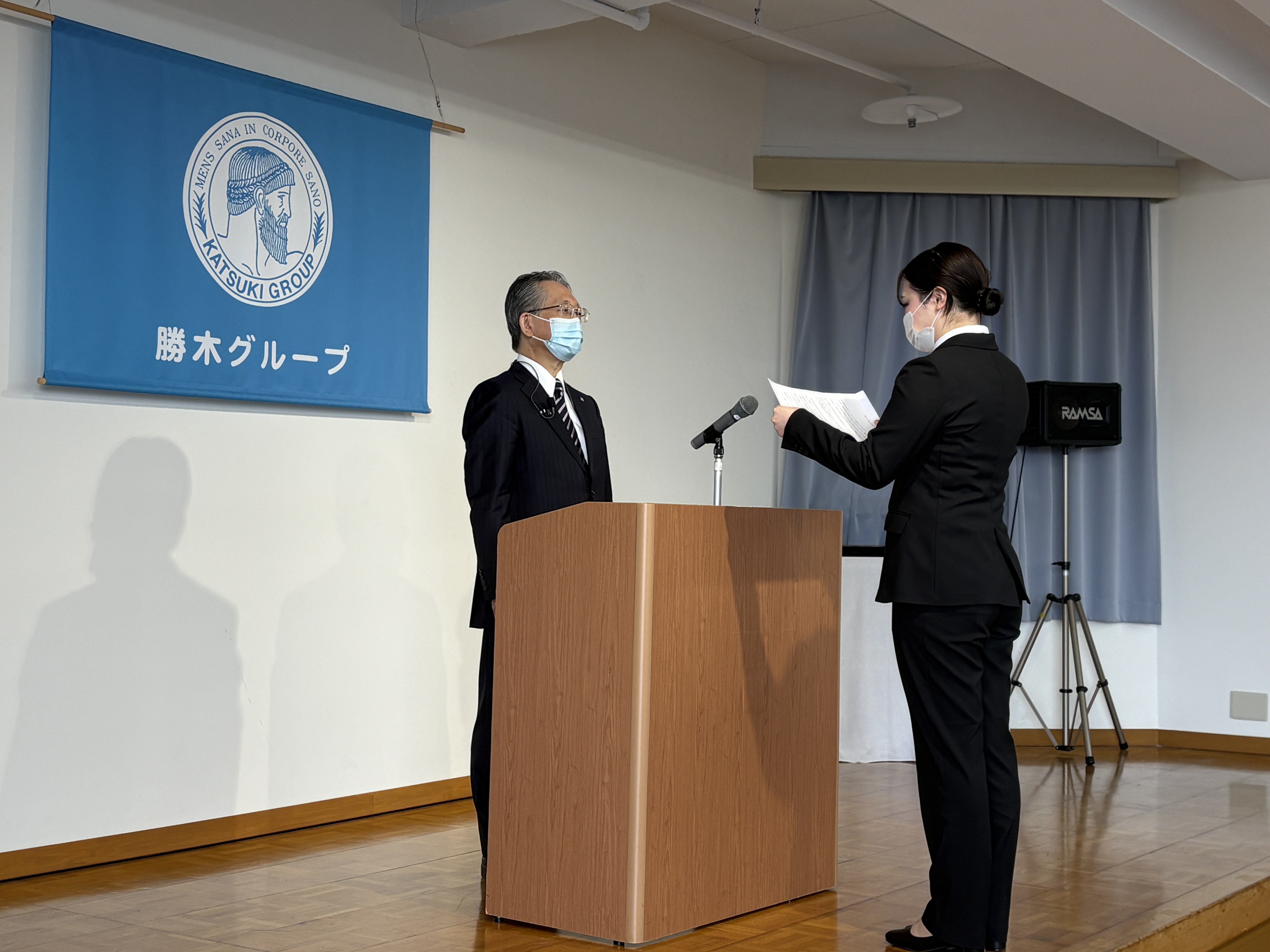 勝木保夫代表から一人ひとりに辞令交付がなされた後、新入職員代表が新社会人としての決意表明をいたしました。
