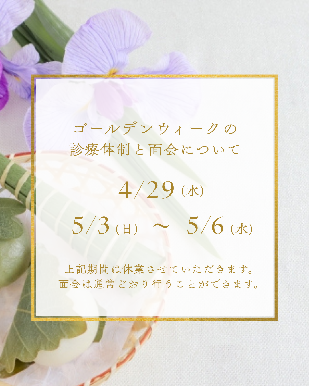 4月29日(水)および、5月3日(日)~5月6日(水)が休診日となります。